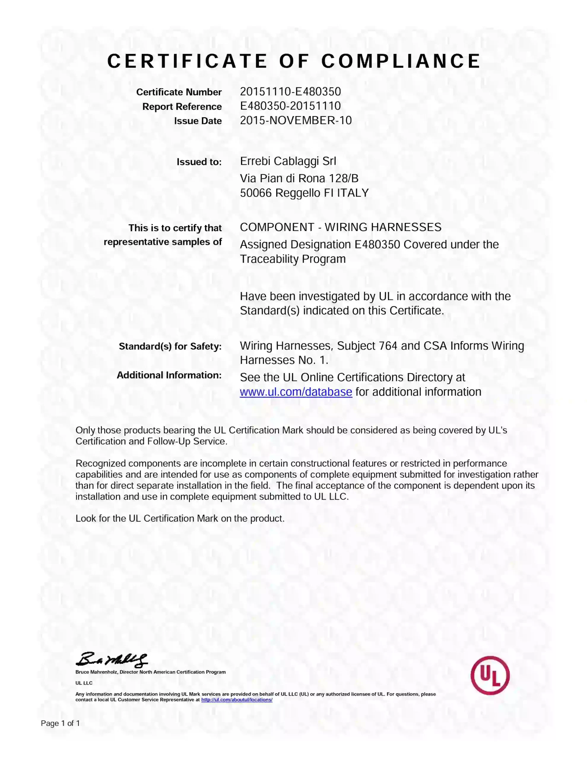 Certificate of conformity issued to ErreBi Group, attesting the compliance with international standards for production and quality control.