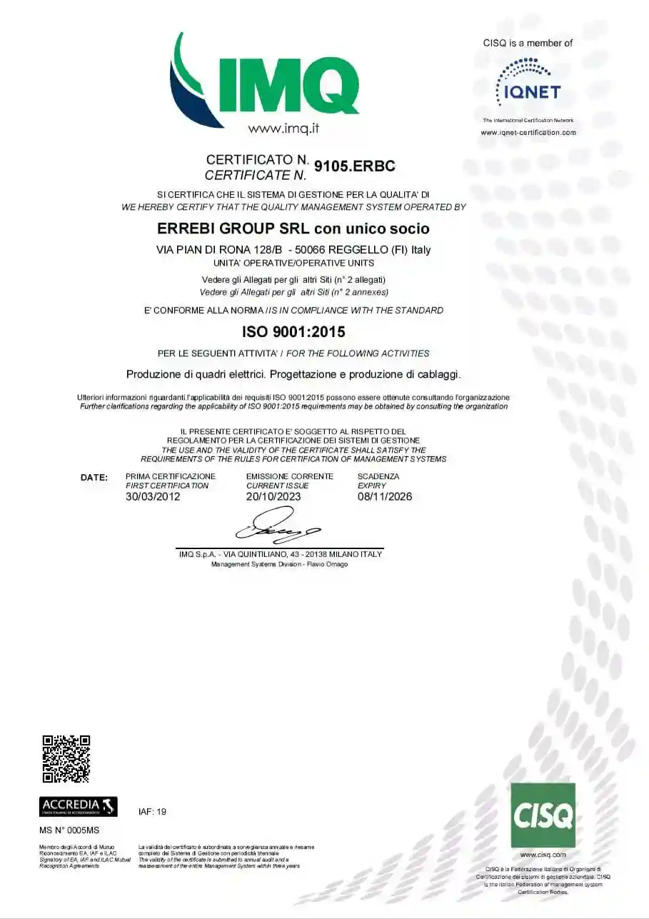 Certification ISO 9001:2015 of ErreBi Group, which guarantees a quality management system in accordance with globally recognized standards.
