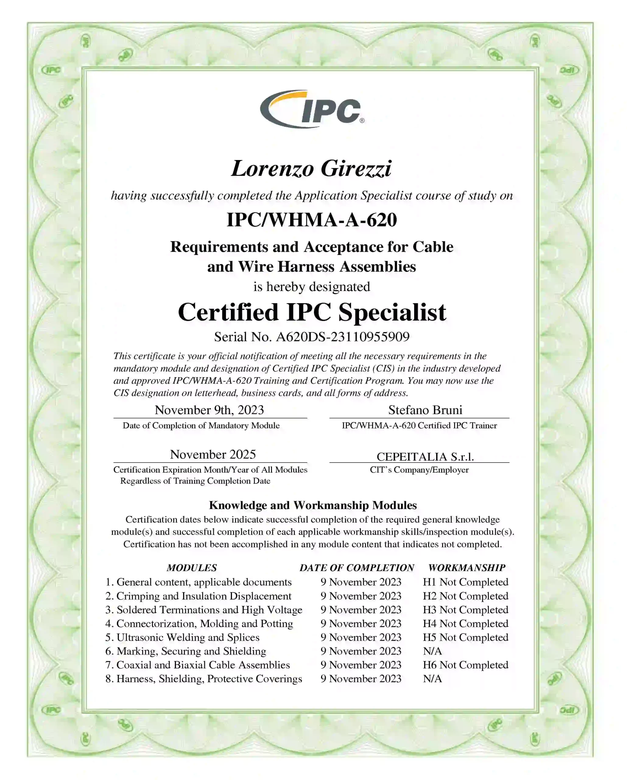 IPC Certified Specialist certification by ErreBi Group, certifying the competence of personnel in the production of reliable electronic assemblies.